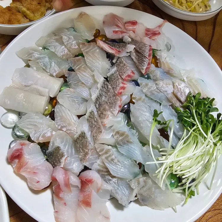 또한, 회와 함께 나오는 반찬들도 다양해요. 전통적인 한국식 반찬들이 잘 어우러져 있어, 식사를 더욱 풍성하게 만들어줍니다.