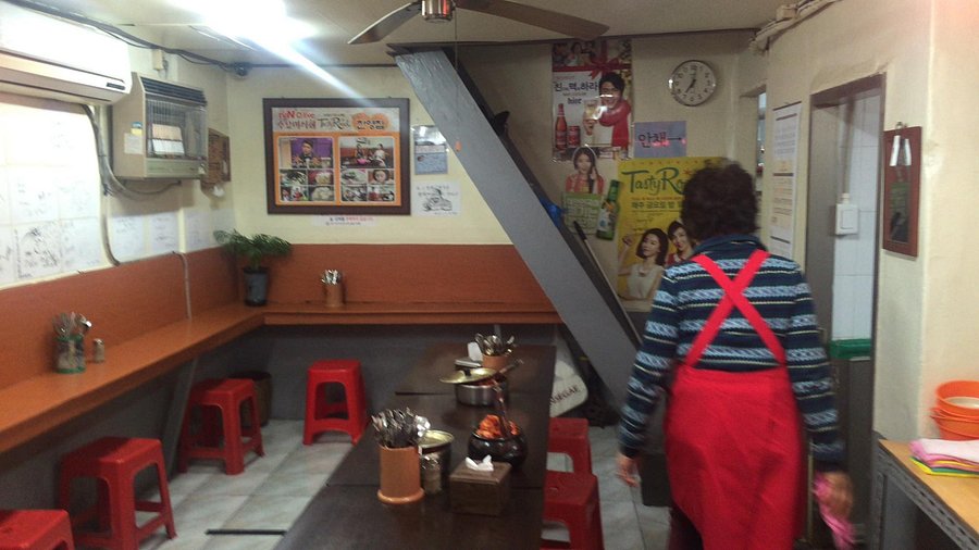 식당 내부는 아늑하고 따뜻한 느낌을 주며, 전통적인 한국의 인테리어가 돋보입니다. 벽에는 손글씨로 적힌 메뉴와 포스터들이 있어 친근한 분위기를 자아내요.