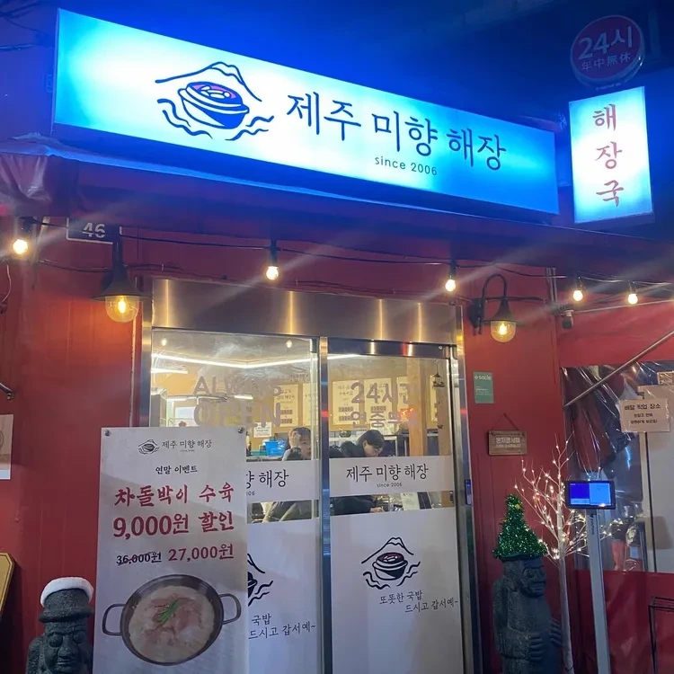 제주미향해장은 청량리 경동시장 내에 위치해 있어요. 이곳은 2006년부터 운영되고 있으며, 제주식 해장국을 전문으로 하고 있어요. 식당 외관은 아담하면서도 따뜻한 느낌을 주며, 입구에는 귀여운 돌하르방이 장식되어 있어요.