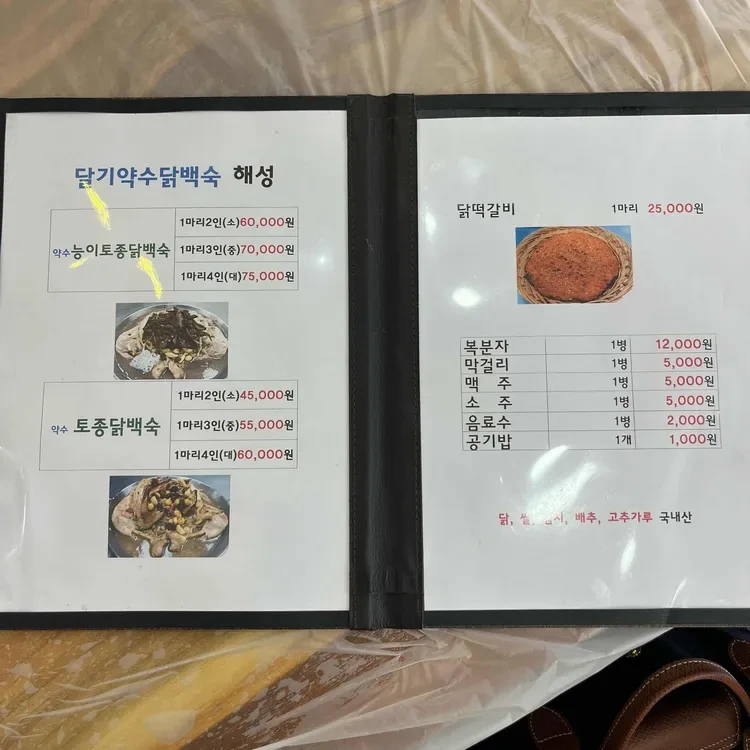 이곳의 대표 메뉴는 약수토종닭 능이백숙이에요. 가격은 소 사이즈가 60,000원, 중 사이즈가 70,000원, 대 사이즈가 75,000원이에요. 또한, 일반 약수토종닭백숙은 소 사이즈가 45,000원, 중 사이즈가 55,000원, 대 사이즈가 60,000원으로 제공돼요. 이 외에도 수제닭떡갈비가 25,000원에 판매되고 있어요. 메뉴판을 보면 다양한 옵션이 있어 선택의 폭이 넓어요.