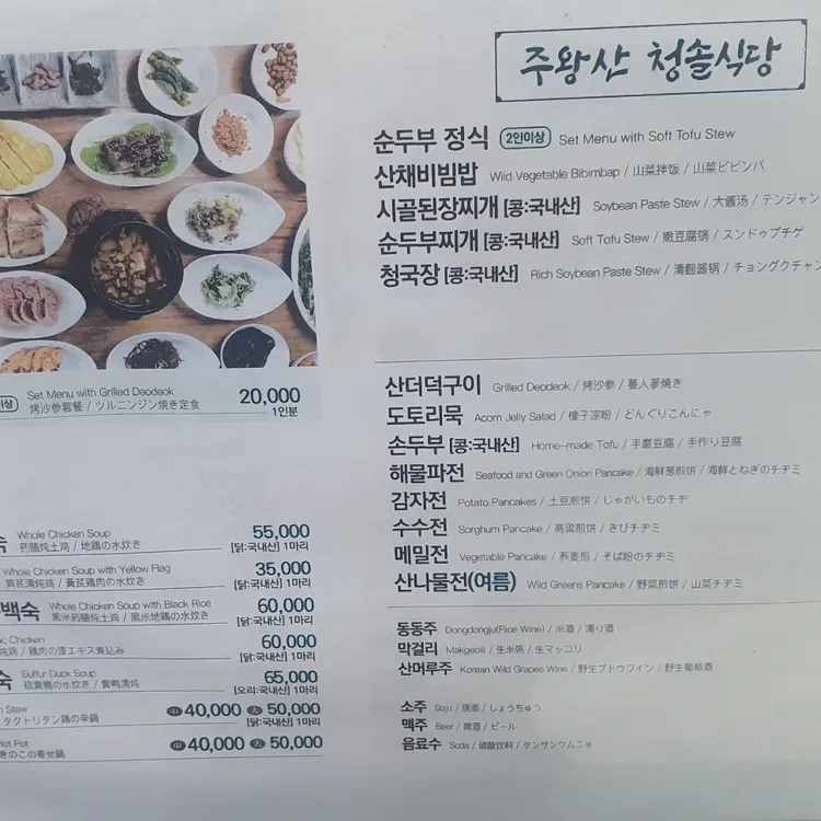 청송 주왕산청솔식당의 메뉴는 다양하고 가격대도 합리적이에요. 특히 추천하는 메뉴는 부드러운 두부가 들어간 된장찌개와 신선한 나물로 만든 비빔밥이에요. 가격은 대체로 20,000원에서 55,000원 사이로, 가족 단위 방문객들에게도 부담 없는 가격이에요.