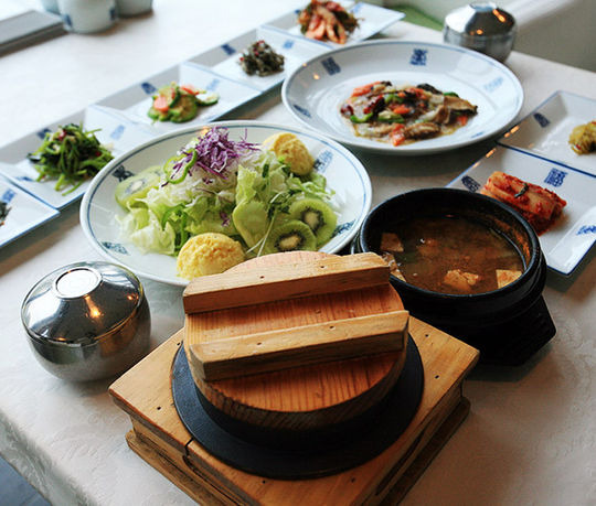 테이블 세팅은 깔끔하고 정갈하며, 다양한 반찬들이 아름답게 배열되어 있어 시각적으로도 즐거움을 줍니다.