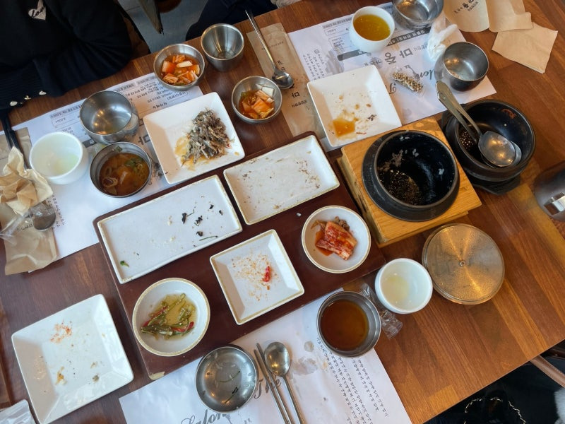 식사가 끝난 후 테이블 위에는 빈 접시와 그릇들이 남아 있었지만, 그만큼 맛있게 먹었다는 증거겠죠? 특히, 나박김치와 함께 나온 해물파전은 정말 맛있었어요.