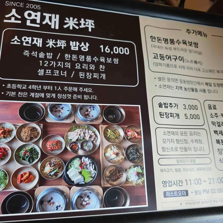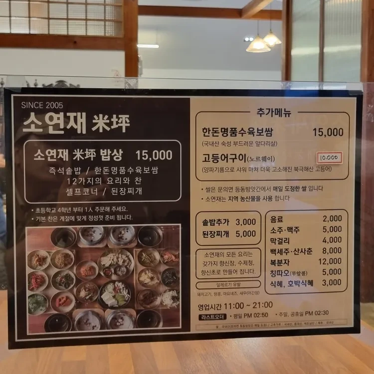 소연재의 메뉴는 다양하고 가격도 합리적이에요. 가장 인기 있는 메뉴는 '소연재 밥상'으로, 가격은 15,000원이랍니다. 이 메뉴에는 12가지의 반찬과 함께 밥, 국이 제공되며, 각종 제철 재료를 사용해 신선한 맛을 느낄 수 있어요. 또한, '한돈명품수육보쌈'과 '고등어구이'도 추천할 만한 메뉴로, 각각 15,000원과 10,000원에 즐길 수 있습니다. 추가 반찬이나 음료는 2,000원에서 5,000원 사이로 제공되니, 다양한 선택이 가능하답니다.