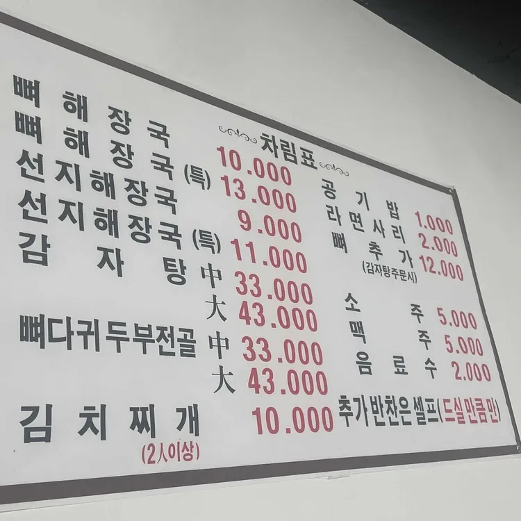 진성해장국의 메뉴는 정말 다양해요. 해장국은 보통맛과 얼큰한 맛으로 나뉘는데, 개인적으로 얼큰한 맛을 추천해요. 가격은 해장국이 9,000원에서 13,000원 사이로, 감자탕은 중짜가 33,000원, 대짜가 43,000원이에요. 김치찌개는 10,000원으로, 가격대가 합리적이어서 부담 없이 즐길 수 있어요.