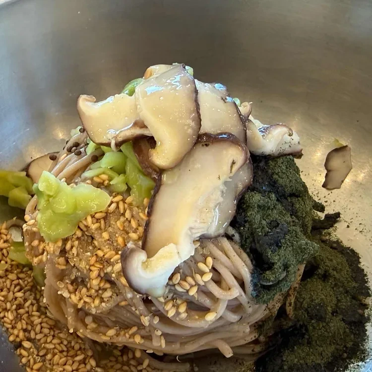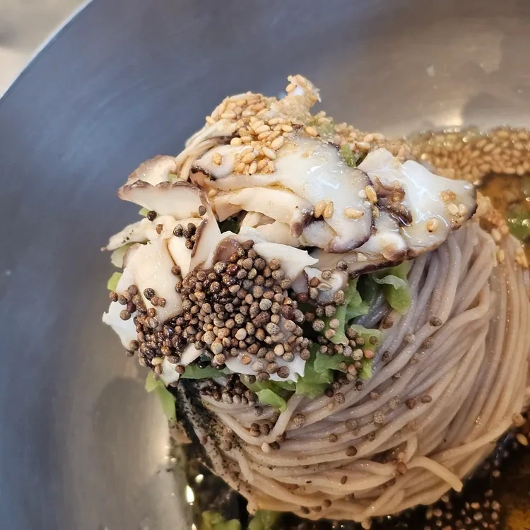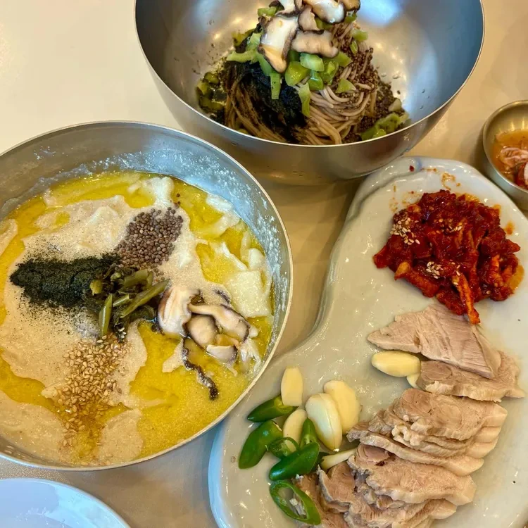 막국수와 함께 나오는 다양한 반찬들도 정말 맛있어요. 특히, 고기와 함께 곁들여 먹는 마늘과 고추, 매운 양념이 조화를 이루어 더욱 풍성한 맛을 느낄 수 있어요.