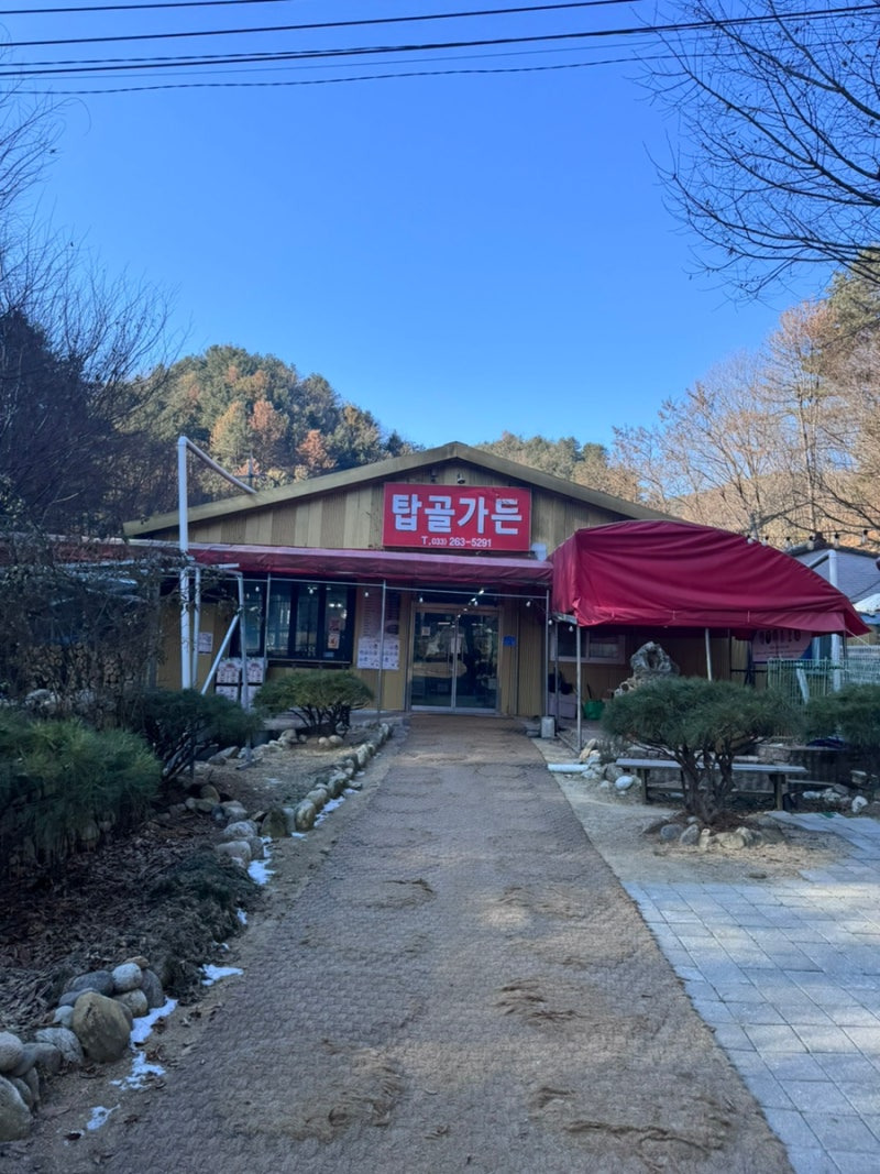 탑골가든은 춘천시 남산면에 위치해 있어요. 주변은 자연으로 둘러싸여 있어, 식사하면서도 편안한 기분을 느낄 수 있답니다. 식당의 외관은 나무와 벽돌로 이루어져 있어 아늑한 느낌을 주고, 입구에는 큰 닭 모형이 반겨주고 있어요.