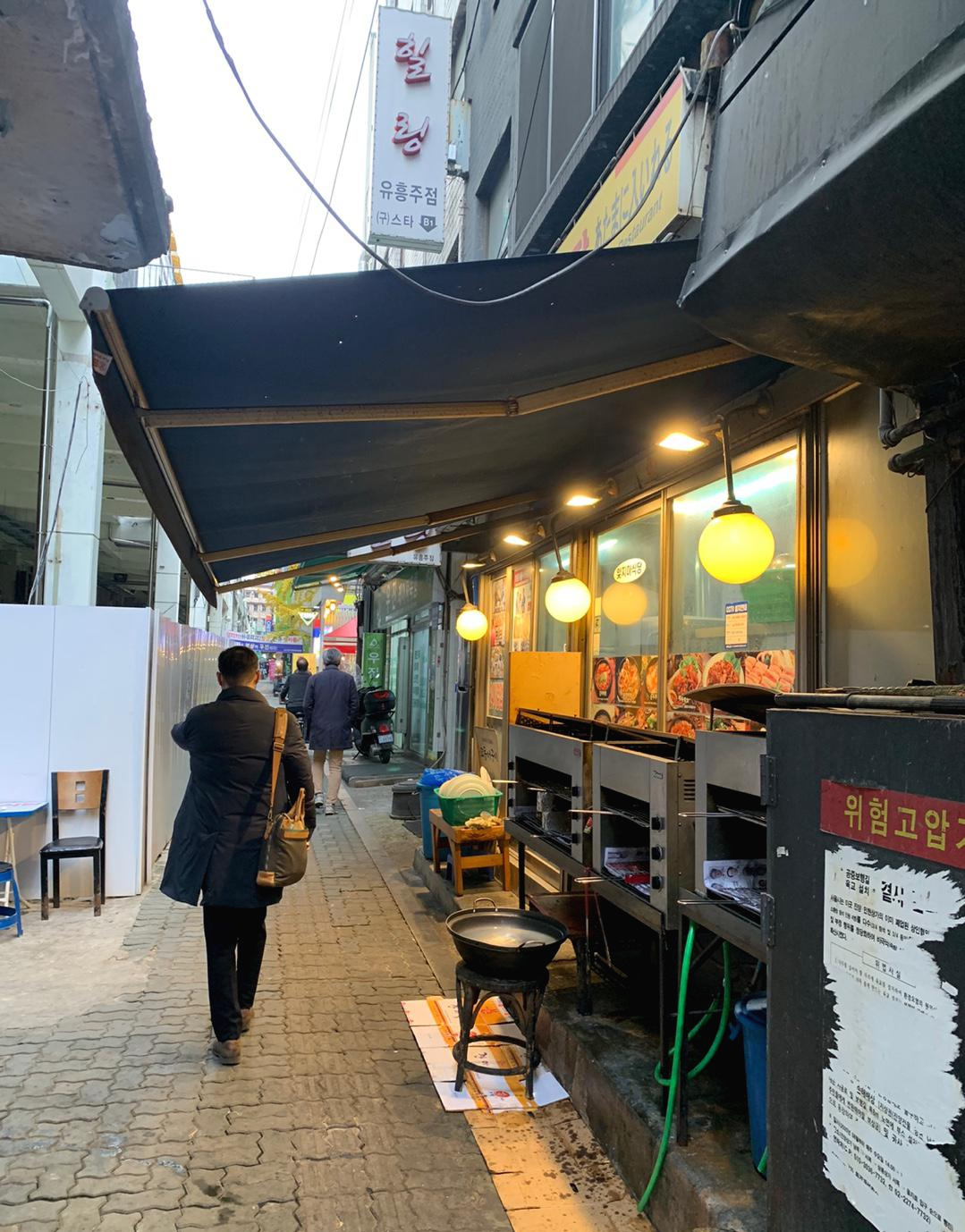 식당 외부는 활기찬 분위기로, 주변에 다양한 먹거리가 있는 거리와 연결되어 있어요.