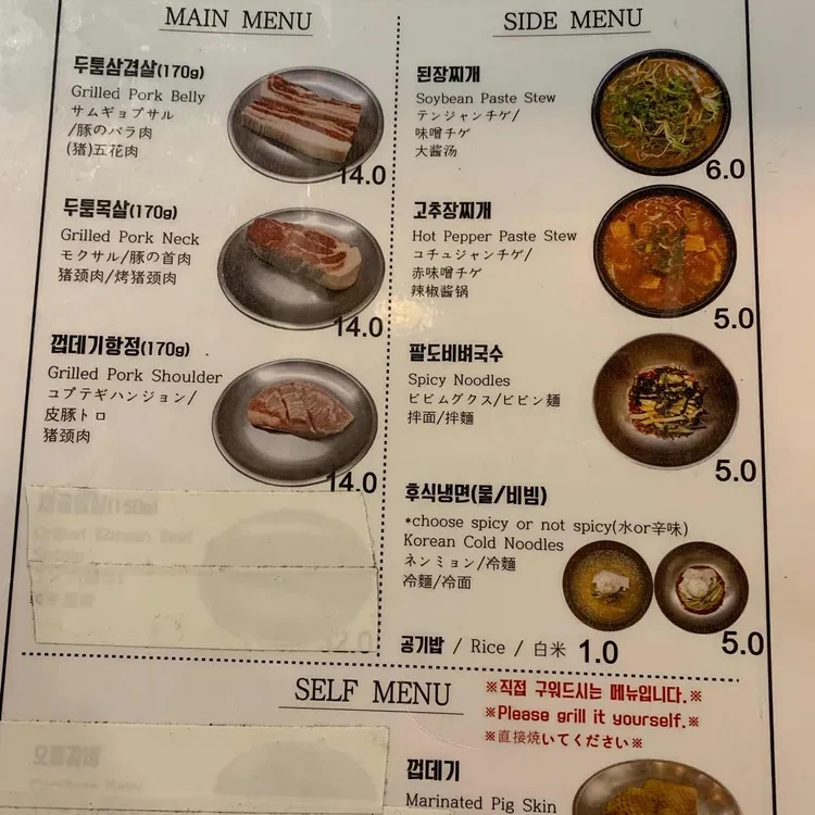 메뉴판을 보면, 삼겹살 외에도 목살, 항정살 등 다양한 고기 종류가 있으며, 사이드 메뉴로는 된장찌개, 고추장찌개, 매운면, 냉면 등이 있어요. 사이드 메뉴는 5,000원에서 6,000원 사이로 저렴하게 즐길 수 있어요. 밥은 1,000원에 제공되니, 함께 주문하면 좋겠죠?