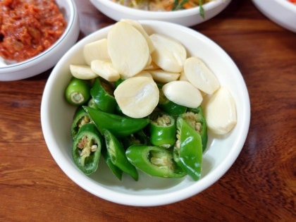 갈비는 잘 구워져서 나오는 데, 고소한 향이 입맛을 돋우고, 함께 나오는 마늘과 고추도 매력적이에요.