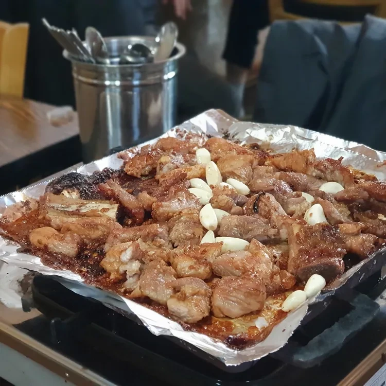 처럼 고기가 구워지는 소리와 함께 사람들의 웃음소리가 가득한 곳이에요. 외부에는 빨간 플라스틱 의자가 놓여져 있어, 여유롭게 앉아 식사를 즐길 수 있는 공간이 마련되어 있어요.