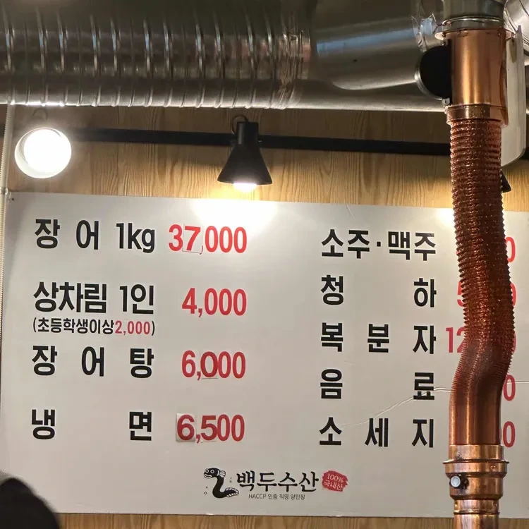 백두수산의 메뉴는 다양하지만, 특히 추천하고 싶은 메뉴는 장어에요. 장어는 1kg에 37,000원으로, 신선한 재료를 사용해 요리해요. 상차림은 1인 기준 4,000원이며, 학생 할인도 제공하니 참고하세요. 장어탕은 6,000원, 냉면은 6,500원으로, 여름철에 특히 인기가 많아요.
