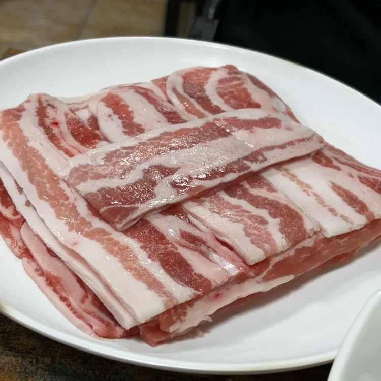 고기를 주문하면, 두툼하게 썰린 삼겹살이 나와요.