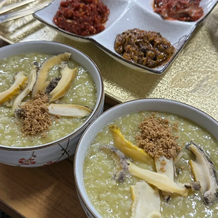 전복죽은 부드럽고 고소한 맛이 일품이에요. 전복의 신선한 맛이 죽에 스며들어 깊은 풍미를 느낄 수 있어요. 특히, 전복 위에 뿌려진 갈색 설탕이 달콤함을 더해줘서, 한 입 먹으면 정말 행복해지는 맛이에요.