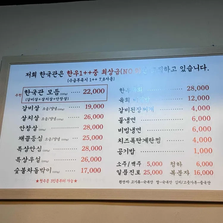 한국관의 메뉴는 다양하지만, 특히 추천하고 싶은 메뉴는 "한국관 모듬"이에요. 이 메뉴는 다양한 부위의 한우를 맛볼 수 있는 기회를 제공해주며, 가격은 22,000원이랍니다. 그 외에도 갈비, 살치살, 안창살 등 다양한 고기 메뉴가 준비되어 있어요. 가격대는 17,000원에서 28,000원 사이로, 고기 질에 비해 매우 합리적이에요.