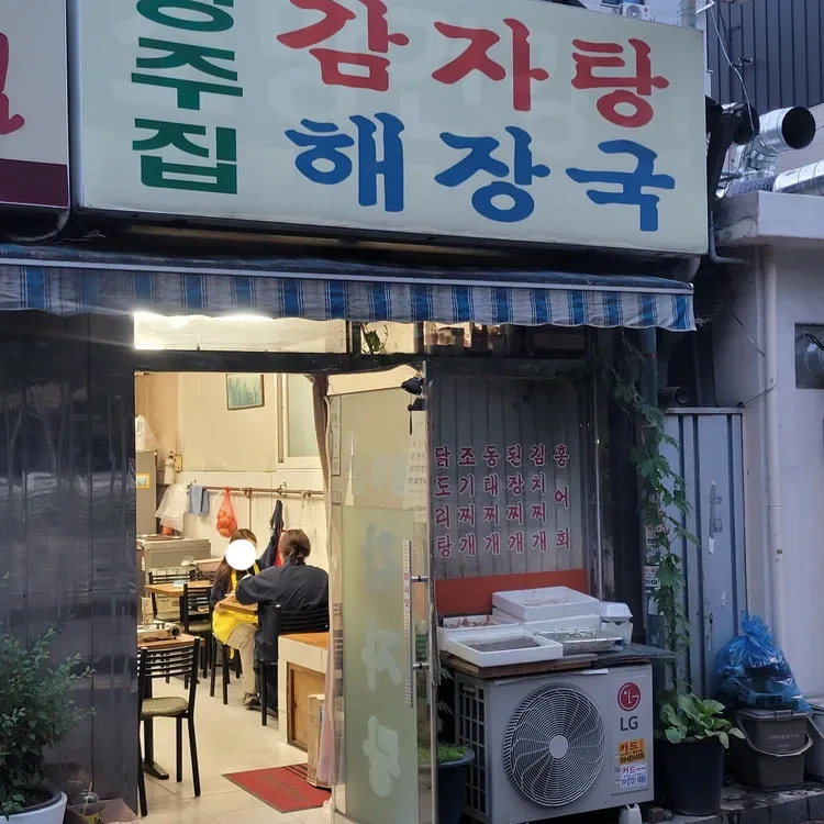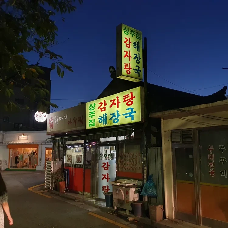 상주식당은 한성대역 1번 출구에서 도보로 약 5분 거리에 위치해 있어요. 외관은 아담하고 아늑한 느낌을 주며, 간판에는 "감자랑 해장국"이라는 글씨가 큼지막하게 적혀 있어요.