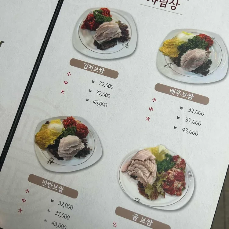 각시보쌈의 대표 메뉴는 보쌈이에요. 보쌈은 여러 종류가 있는데, 김치보쌈, 배추보쌈, 반반보쌈, 굴보쌈 등이 있어요. 가격은 소짜가 32,000원, 중짜가 38,000원, 대짜가 43,000원으로, 양에 비해 가격이 정말 합리적이에요. 특히, 반반보쌈은 두 가지 맛을 동시에 즐길 수 있어 인기가 많답니다.