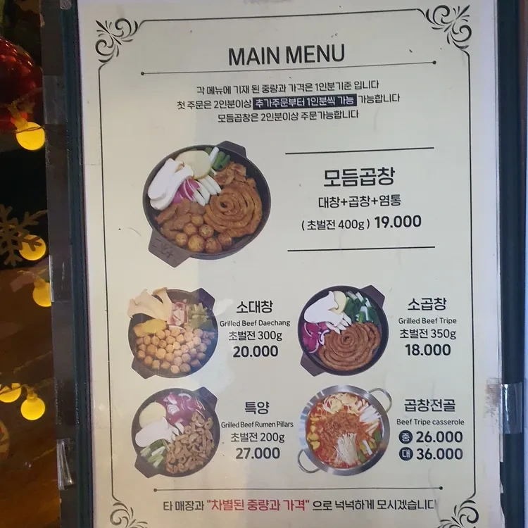 혜화곱창의 메뉴는 다양하고 가격도 합리적이에요. 특히 추천하고 싶은 메뉴는 '모듬곱창'이에요. 400g 기준으로 19,000원이어서 양도 푸짐하고 맛도 일품이에요. 그 외에도 '소대창'은 20,000원, '소곱창'은 18,000원, '특양'은 27,000원으로 가격대가 다양해요. 곱창전골도 26,000원에 제공되니, 곱창을 좋아하는 분들에게는 정말 좋은 선택이 될 거예요.