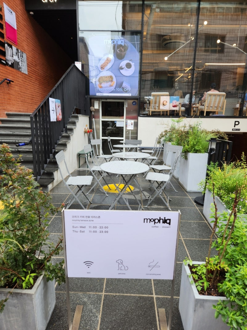 모피크는 홍대의 중심가에 위치해 있어 접근성이 매우 좋아요. 지하철 홍대입구역에서 도보로 약 5분 거리에 위치하고 있어요. 주변에는 다양한 상점과 카페들이 있어, 카페를 방문하기 전이나 후에 다른 곳도 둘러보기에 좋답니다. 카페의 외관은 현대적이고 세련된 디자인으로, 유리로 된 파사드가 인상적이에요.