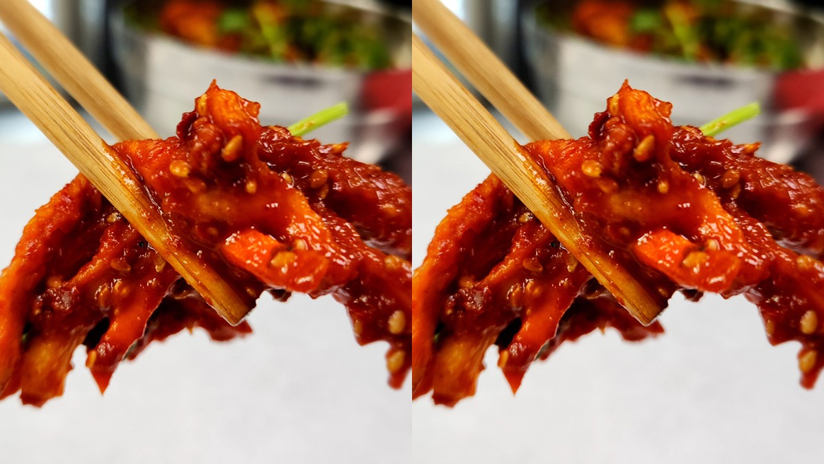 이곳의 대표 메뉴는 바로 홍어닭발이에요. 홍어와 닭발이 조화를 이루는 이 특별한 요리는 매운 소스에 버무려져 있어요.
