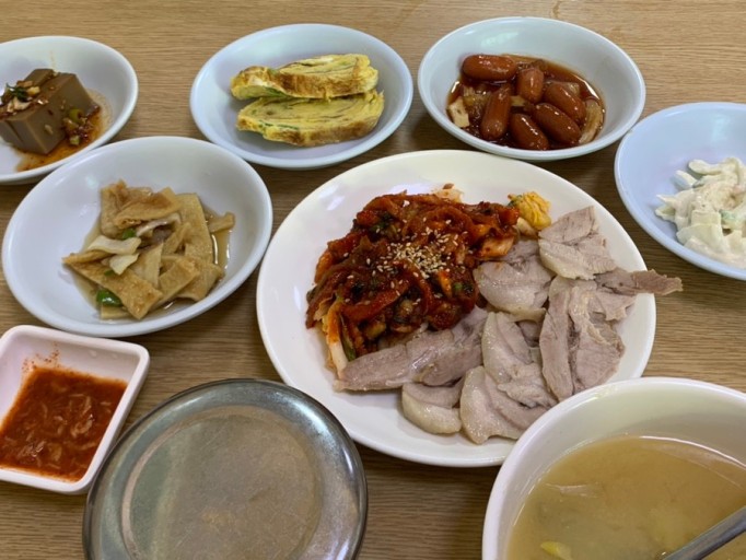 * 푸짐한 보쌈과 함께 계란말이, 소시지볶음, 묵무침 등 다양한 반찬이 제공되어 든든한 한 끼 식사를 즐길 수 있습니다.