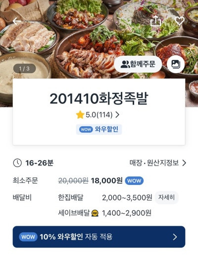 또한, 배달 서비스도 제공하고 있어요. 배달 앱에서 확인해보니, 화정족발은 5.0의 높은 평점을 받고 있더라고요. 최소 주문 금액은 18,000원이며, 배달비는 2,000원에서 3,500원 사이에요.