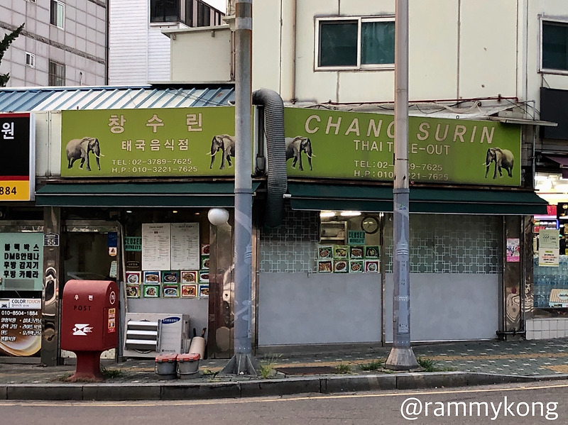 창수린은 후암동의 번화가에 자리 잡고 있어요. 이곳은 태국 가정식의 진수를 느낄 수 있는 곳으로, 외관은 아기자기한 느낌을 주며, 특히 초록색 간판에 그려진 코끼리 그림이 인상적이에요.
